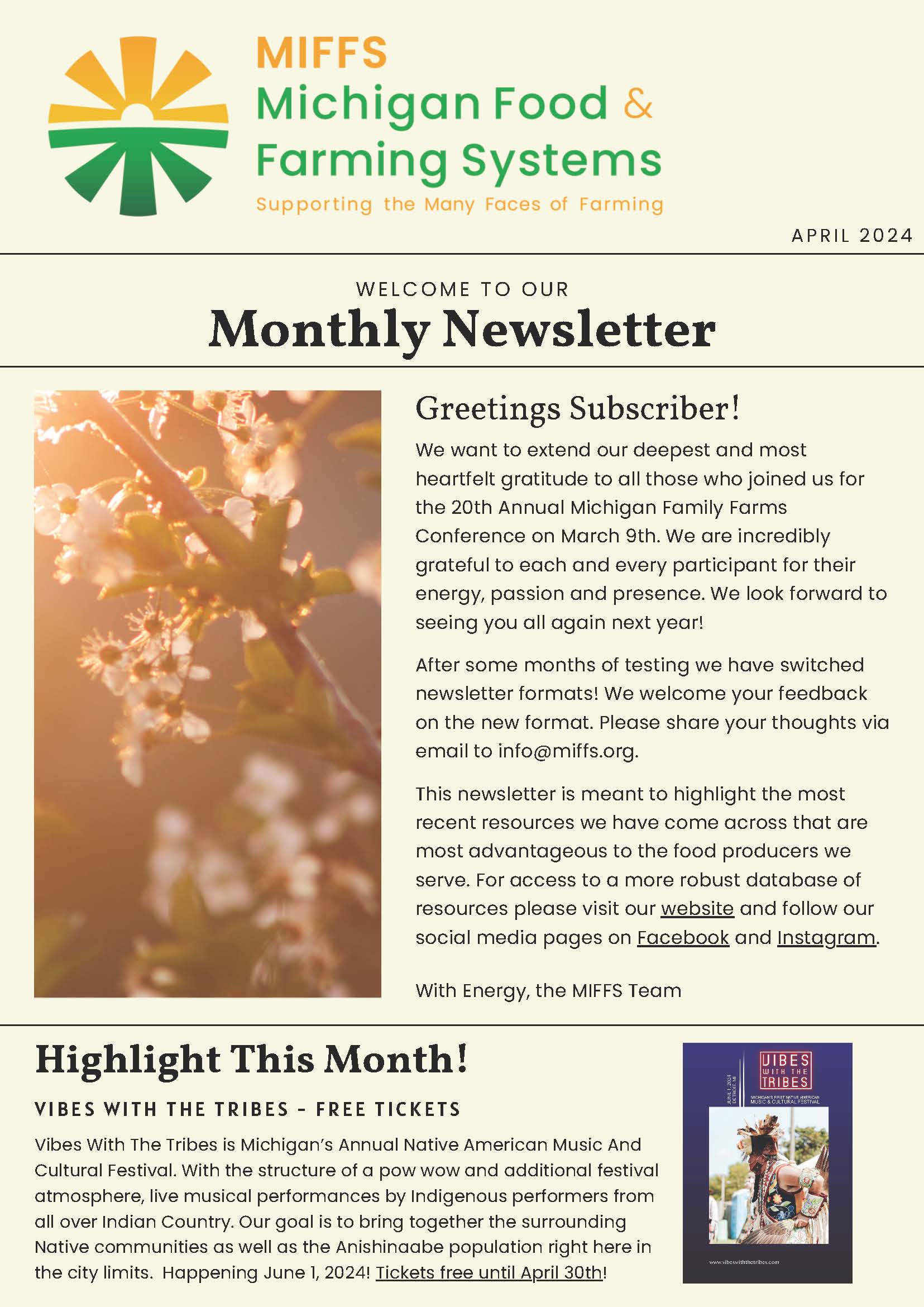 The MIFFS monthly newsletter comes out the first Friday of every month. Our newsletter is meant to highlight the most recent educational, funding and employment opportunities available for farmers and food producers.